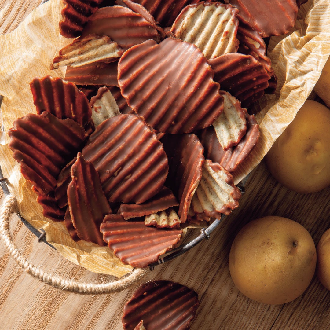 ロイズふと美工場のある北海道・当別町で今年収穫された"新じゃが"のみを使用したポテトチップの片面に、口どけの良いまろやかなチョコレートをコーティング。ミルクの風味が感じられるまろやかでやさしい口あたりのチョコレートをコーティングすることで、新じゃがの味わいをより楽しめるおいしさに仕上げました。
