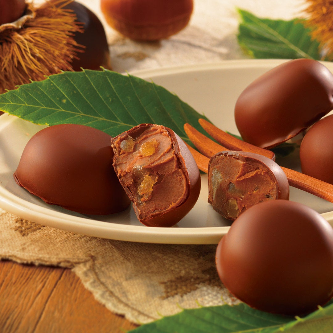 栗が香る繊細なチョコレートの中に、栗風味のコクがあるソースを閉じ込めました。ひと口食べると中からとろりとソースがあふれ出す、栗のおいしさに心まで満たされるショコラです。