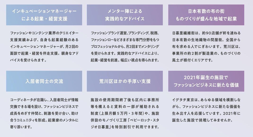 イデタチ東京は、ファッション関連産業で起業したい方をサポートする荒川区の起業支援拠点です。日本有数の布の街、日暮里繊維街に2021年2月オープン。オフィススペースを24時間・365日活用しながら、継続的に成長可能なファッションビジネスを行えるよう、起業・経営をサポートするインキュベーションマネージャーが入居者と月2回必ず面談を行うほか、先輩起業家、デザイナー、弁護士、税理士、コピーライター等、多様な専門分野をもつ8名のメンターが入居者をバックアップします。また、荒川区の各種補助金・助成金や、入居者が退去後区内にオフィス等を構えると月5万円・最大3年間賃料の補助を受けられる制度の利用が可能になります。
