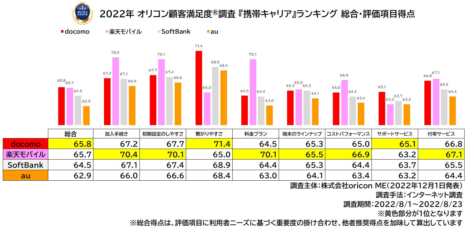 【docomo】が総合1位を獲得 「繋がりやすさ」「サポートサービス」で高評価 【楽天モバイル】は「加入手続き」や「料金プラン」など6つの評価項目で1位を獲得