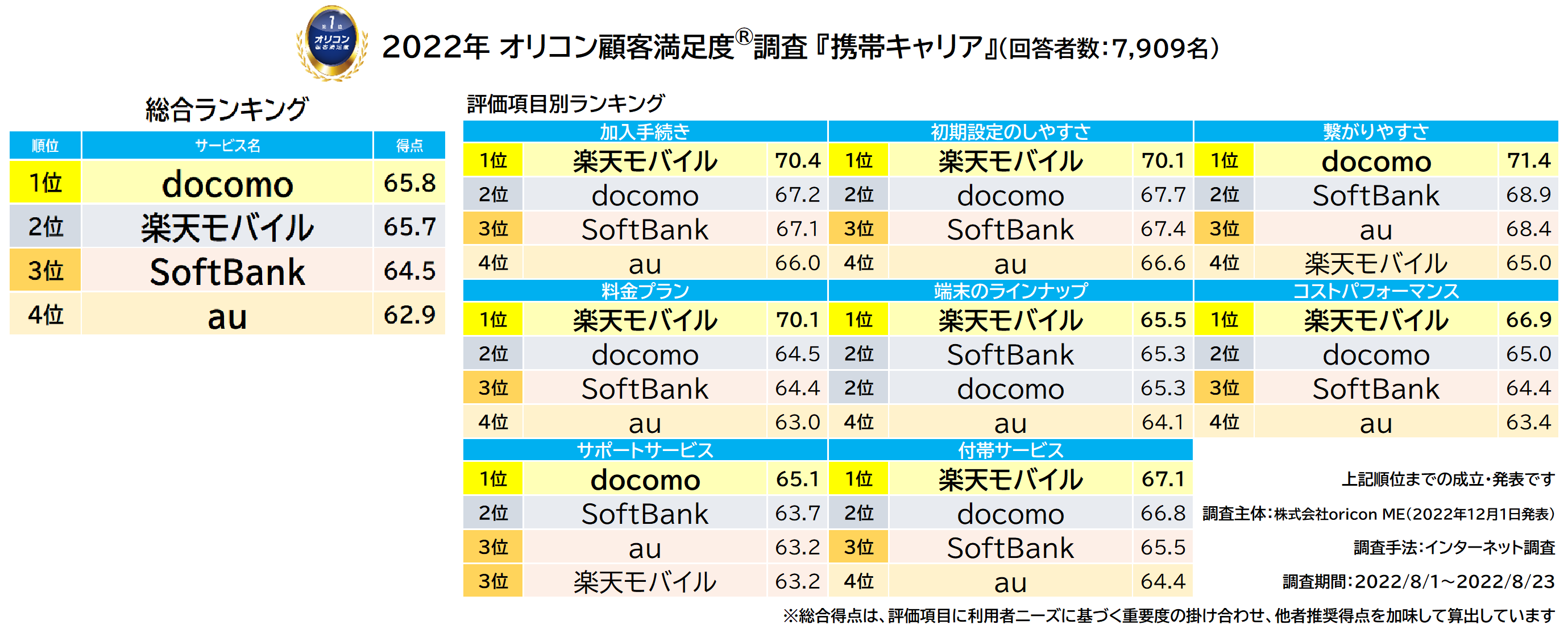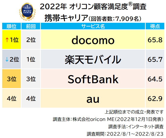 実際の利用者7,909人が評価した『携帯キャリア』ランキング(2022年オリコン顧客満足度®調査)