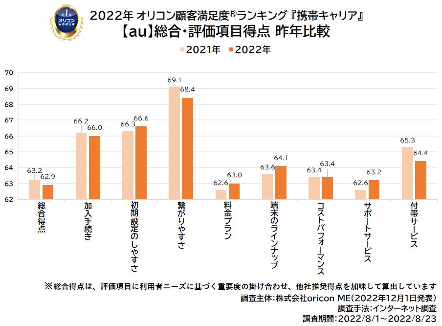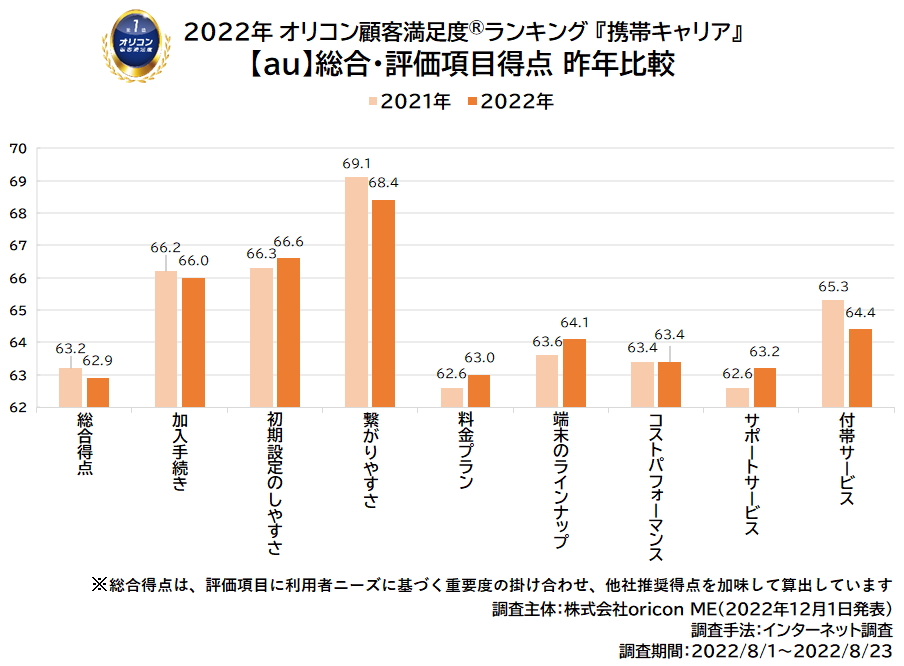 - 【au】が総合4位 4項目で得点伸ばすも、総合得点は減少