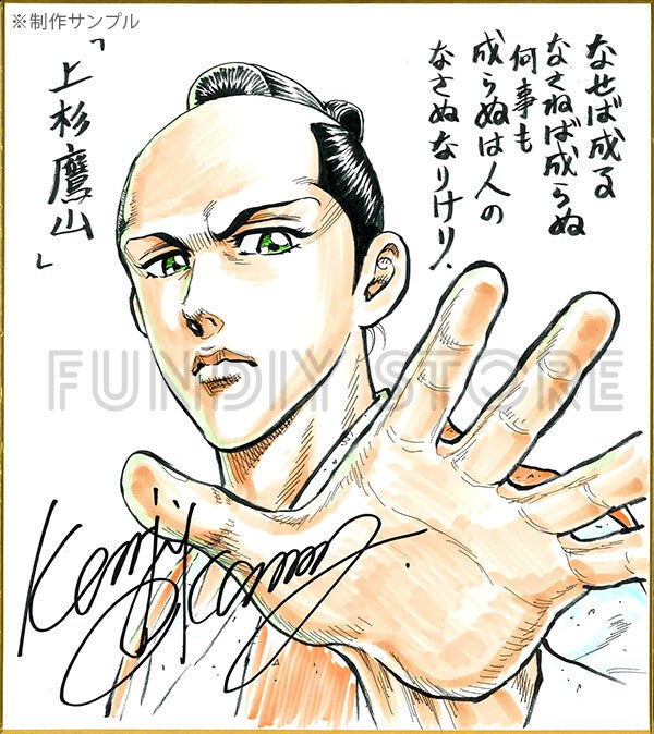 今回は、「武士のフトコロ」「上杉鷹山-米沢藩を救った男-」などの歴史漫画を多数手掛ける岡村賢二先生によるセミオーダーのカラーイラスト色紙販売を開始いたします。また、キャラクターの数や作画イメージなどのリクエストに応えて描き下ろすセミオーダーのカラーイラスト色紙に加えて、「上杉鷹山-米沢藩を救った男-」から限定1枚の販売となる完成品カラーイラスト色紙の2つの商品をラインナップに追加しております。