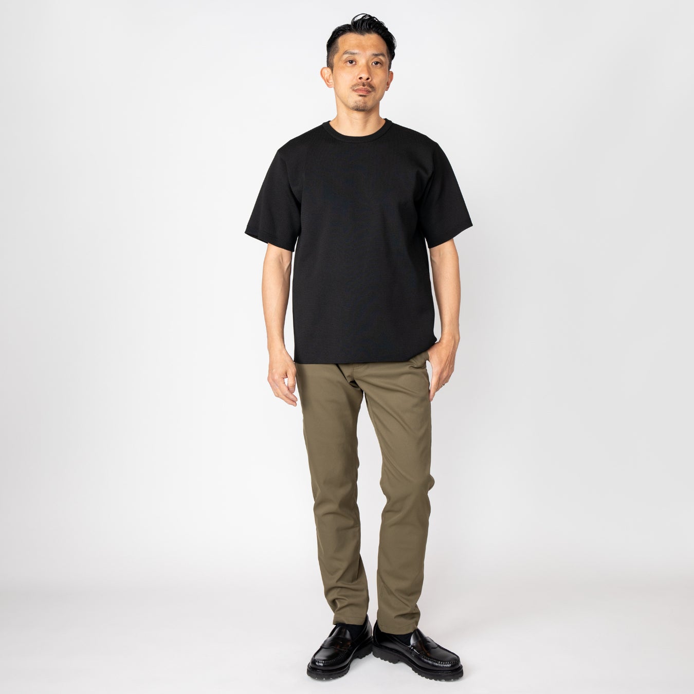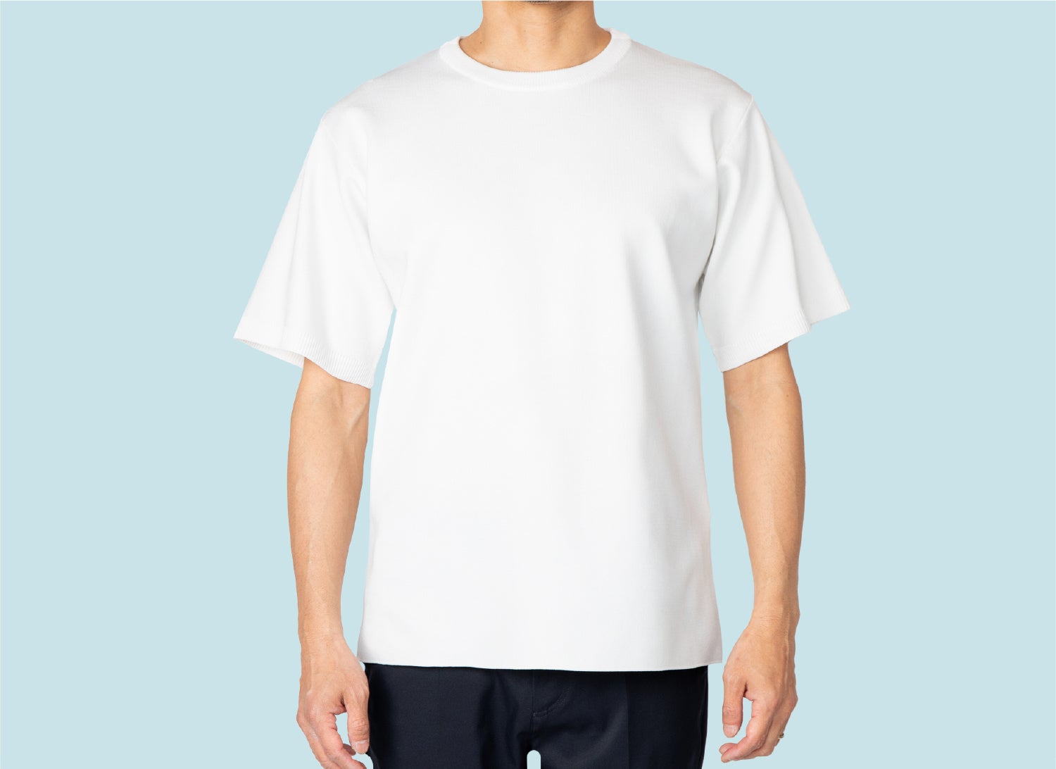 こだわりの製法と素材で、着ているうちに起こるニット特有のヨレや型崩れを軽減。また、表面に抗ピリング加工を施すことで毛玉ができにくく、Tシャツのように扱えます。