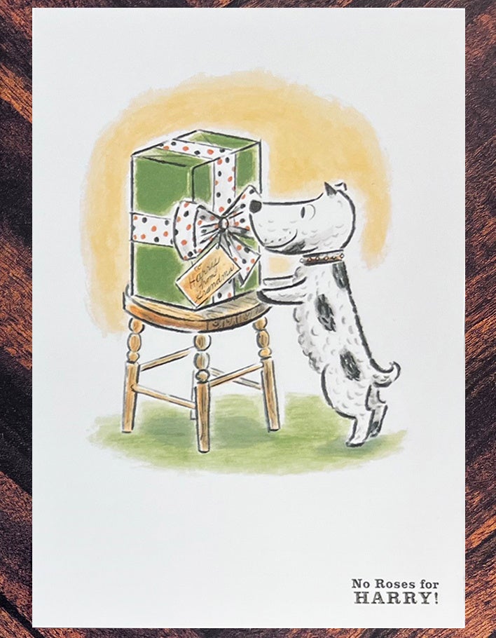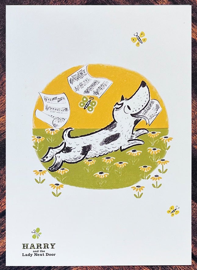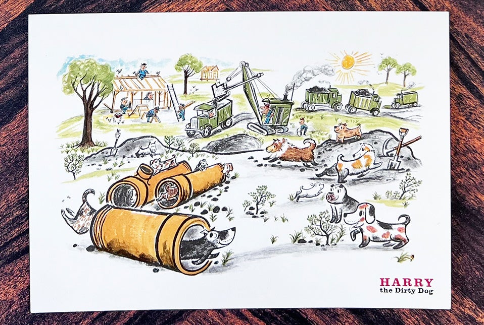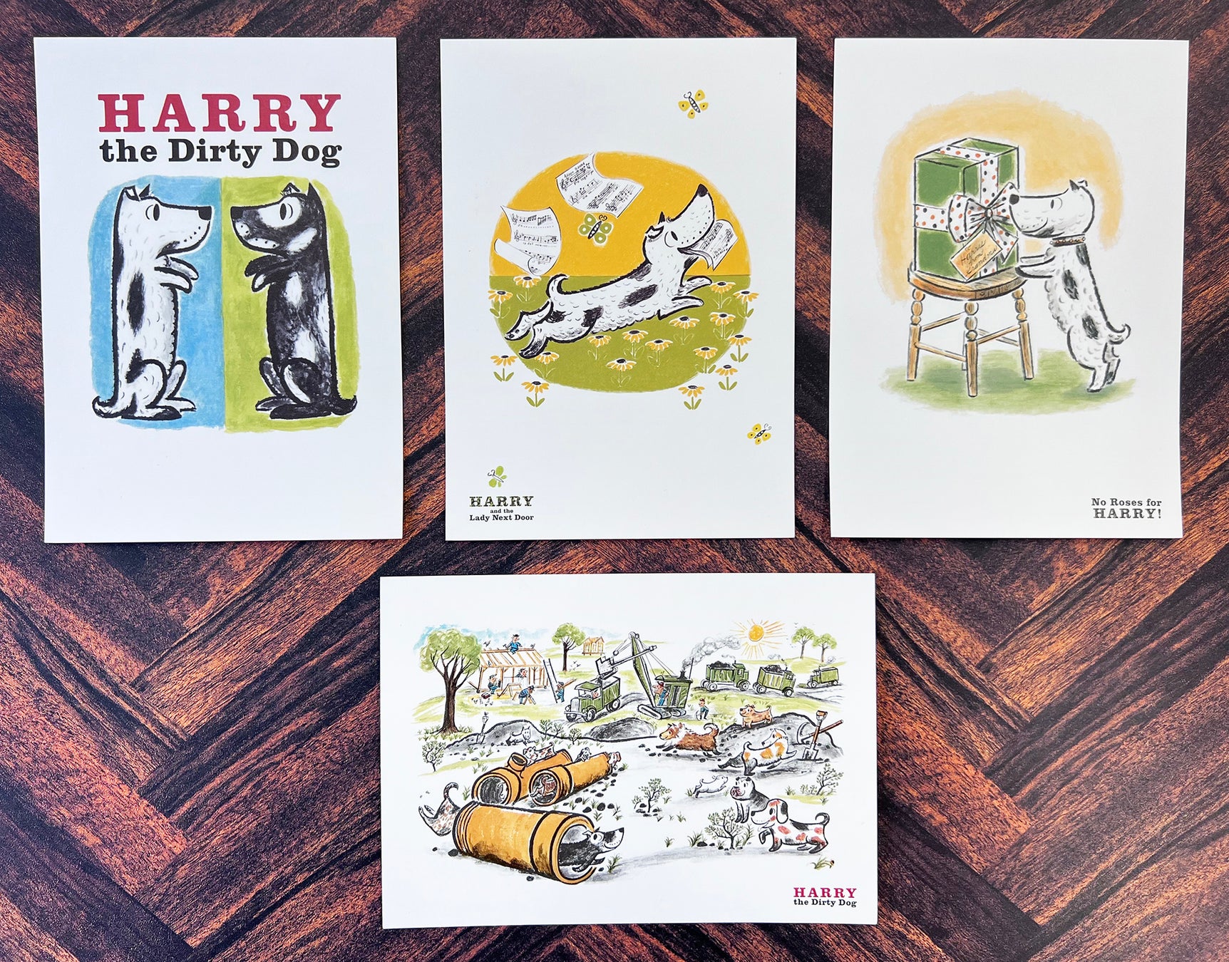 1作目の絵本『Harry the Dirty Dog』だけでなく、『No Roses for Harry!』(ハリーのセーター)、『Harry and the Lady Next Door』(ハリーとうたうおとなりさん)、『Harry by the Sea』(うみべのハリー)からのシーンも登場。今回のグッズ展開は、ポストカード、トートバッグ、プチタオル、パタパタメモの4種となります。