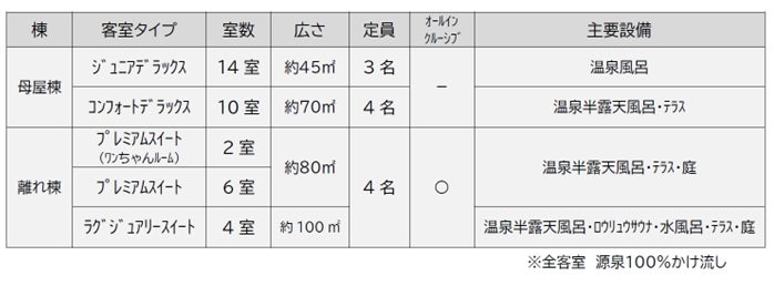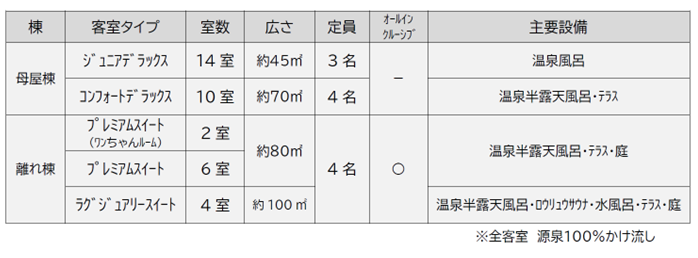 離れ棟の客室は、約80㎡以上の全室スイートルーム。大人4名でもゆっくりと滞在ができる広さがあり、プライベートサウナ付きの客室やワンちゃんと一緒に宿泊ができる客室などもあります。また、全室オールインクルーシブ※のため、滞在中の費用を気にすることなく非日常で優雅なひと時を存分に味わうことができます。