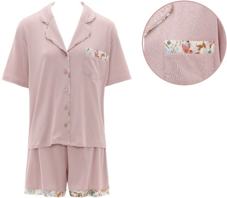 また、とろみがあって肌ざわりのいい綿100%の身生地に、かわいいリバティプリントのパイピングをアクセントにした「サステナビリティプロジェクト made with リバティ・ファブリックス」のルームウェアも好評発売中。半袖&ショートパンツのセットアップなので、暑さの残る今の時季の睡眠にぴったりです!