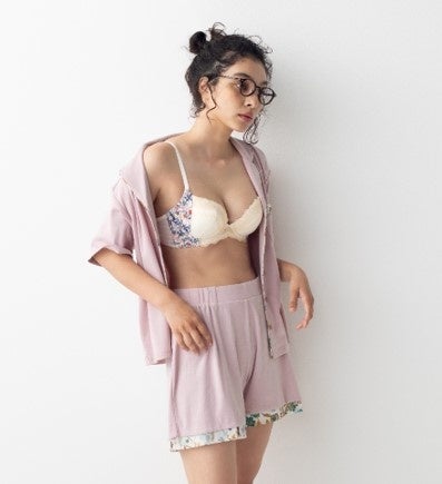 世界中で人気の英国テキスタイルブランド「リバティ・ファブリックス」の余剰生地を活用したサステナブルなカプセルコレクション。チャーミングなプリント生地を、パイピングやポケット口にあしらいました。身生地は綿100%で、とろみのある、なめらかな着ごこちです。ブラジャーやショーツもラインアップしています。