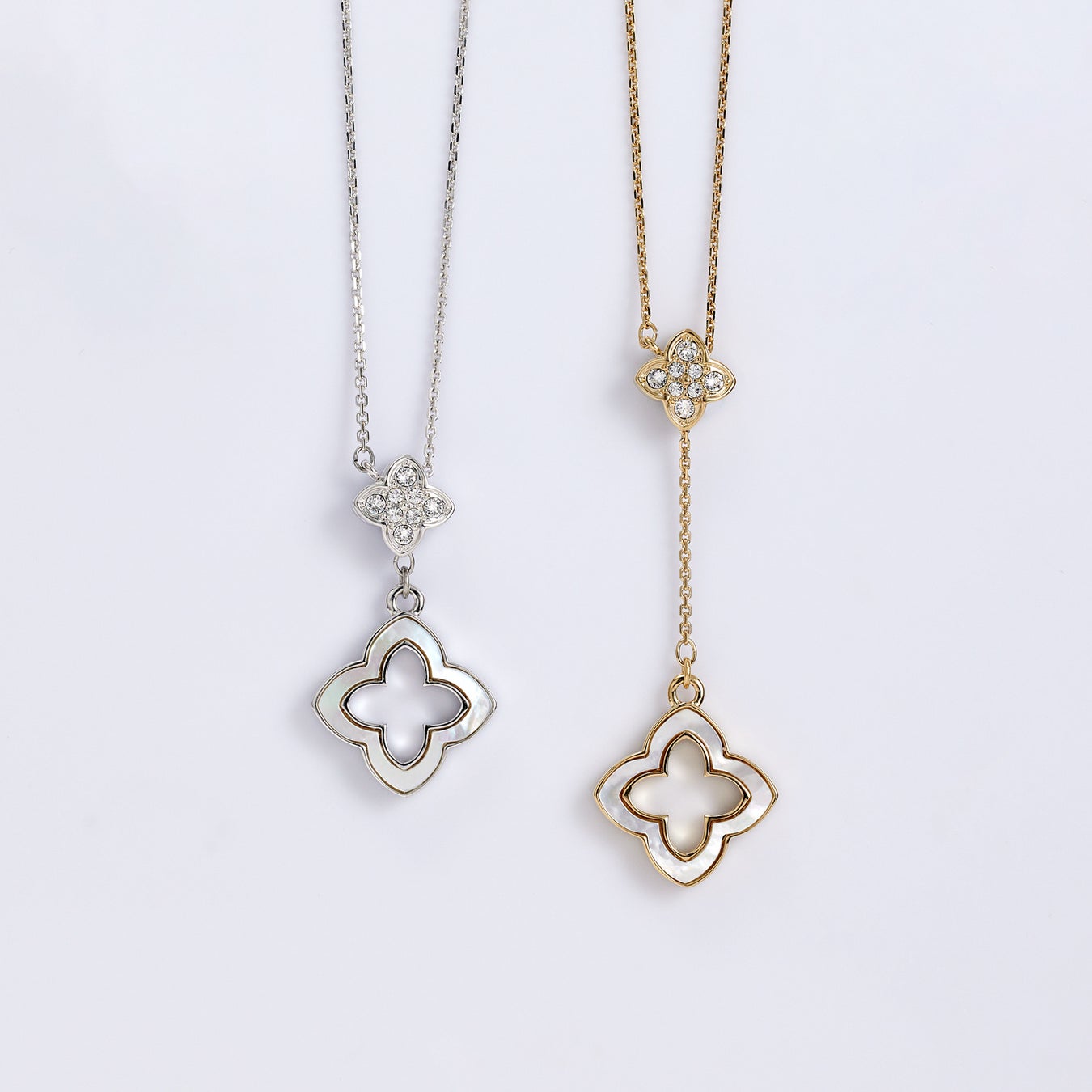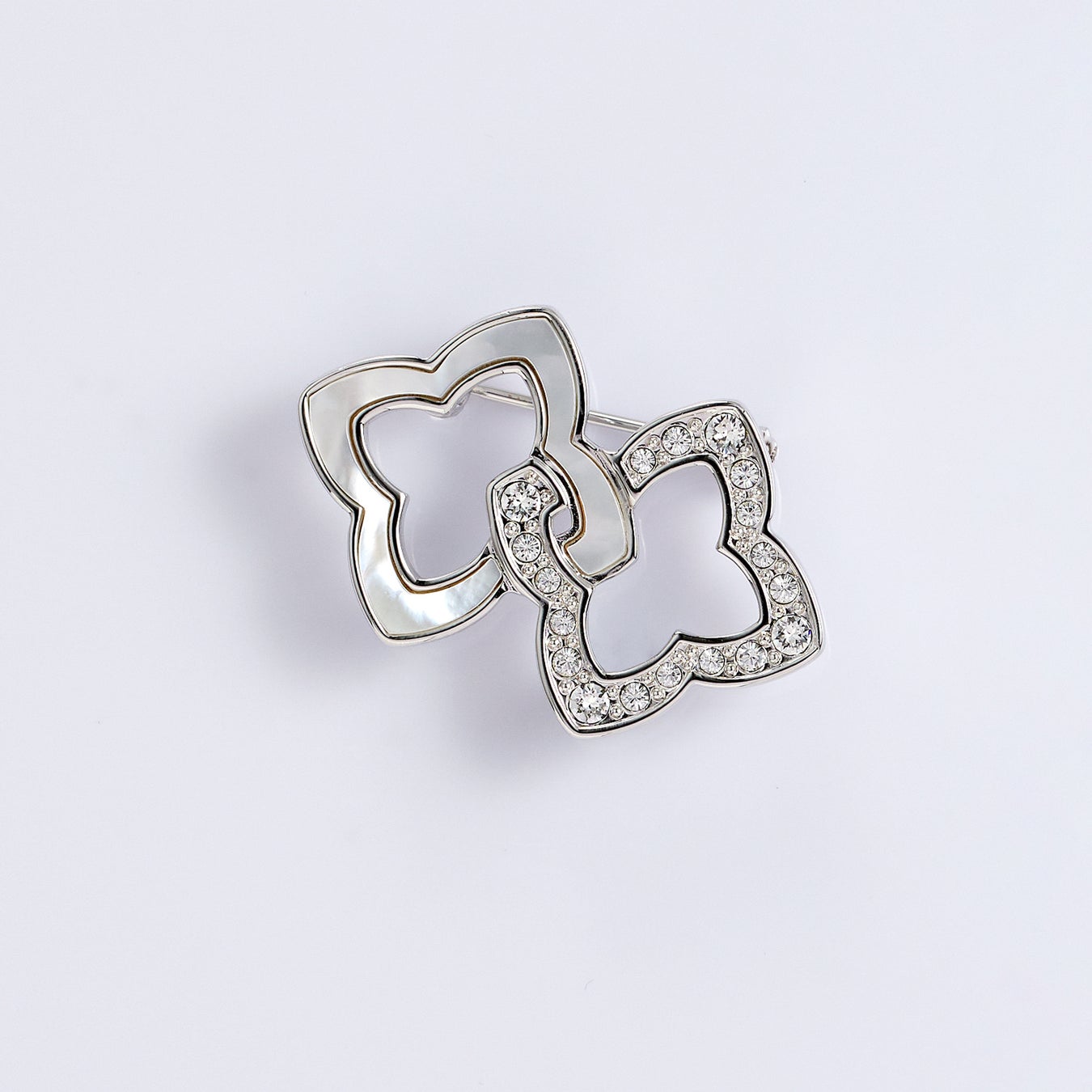 スッキリ磨き上げられた白蝶貝と煌めくカットガラスのコントラストは高級感があり、胸元に華やかさをプラスします。
