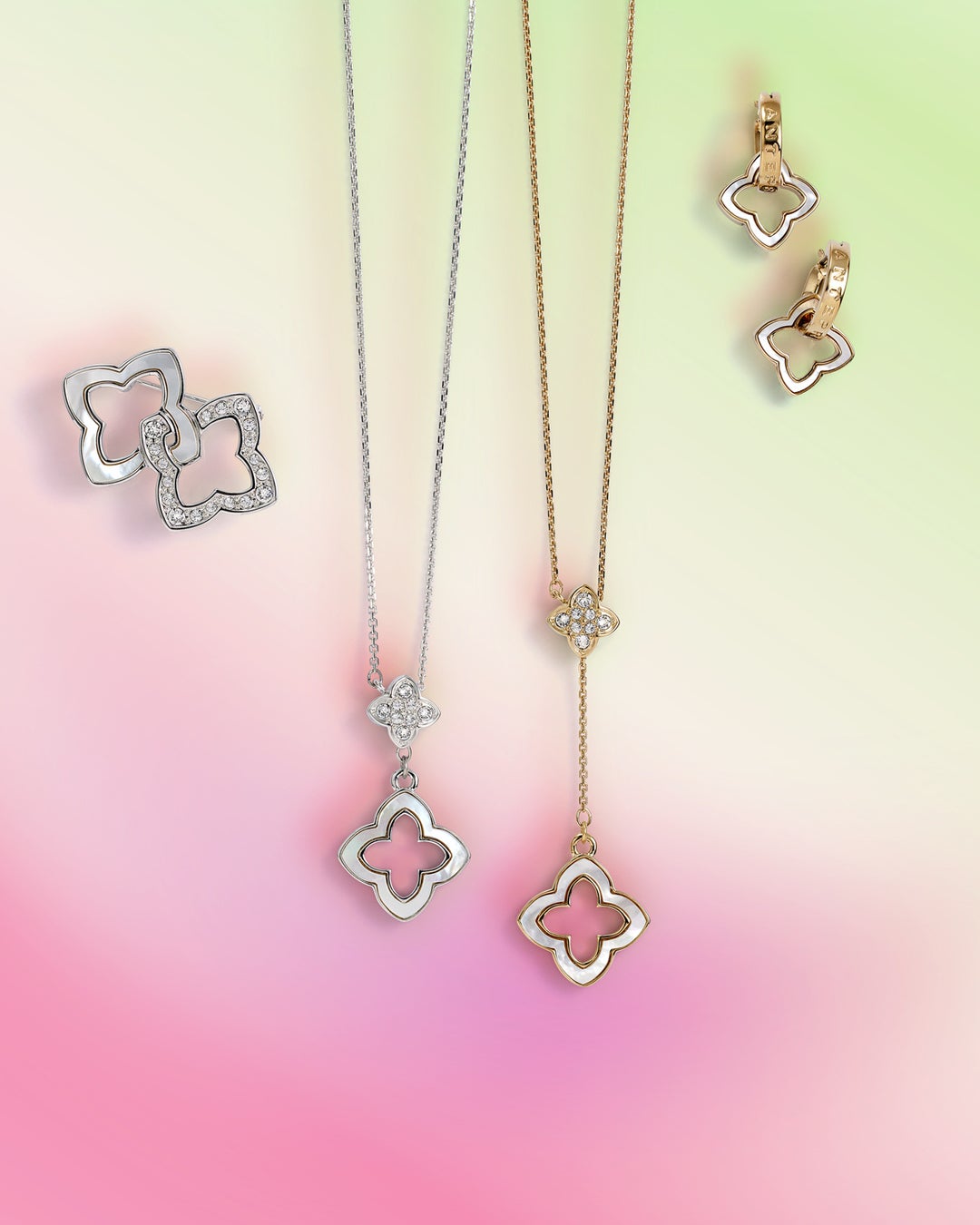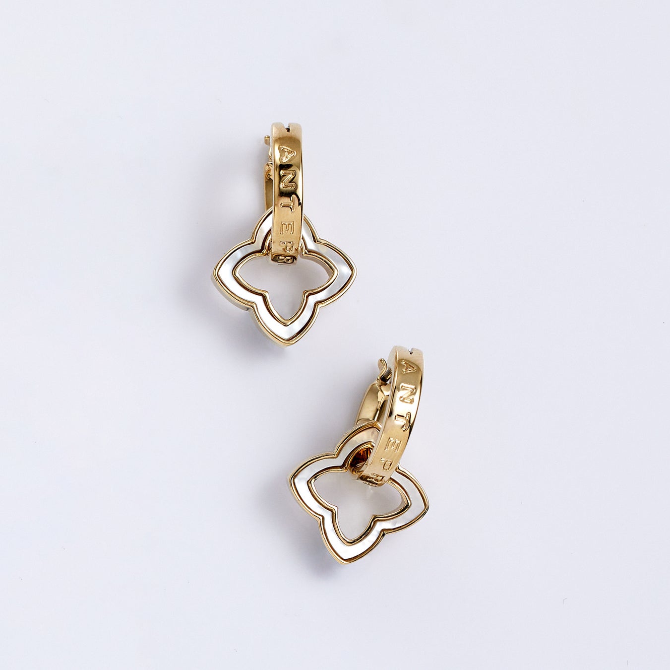 フィオーリモチーフは、表面に白蝶貝、裏面にはカットガラスが敷き詰められたリバーシブル仕様になっており、取り外してシンプルなフープイヤリング(ピアス)としても使うことができます。