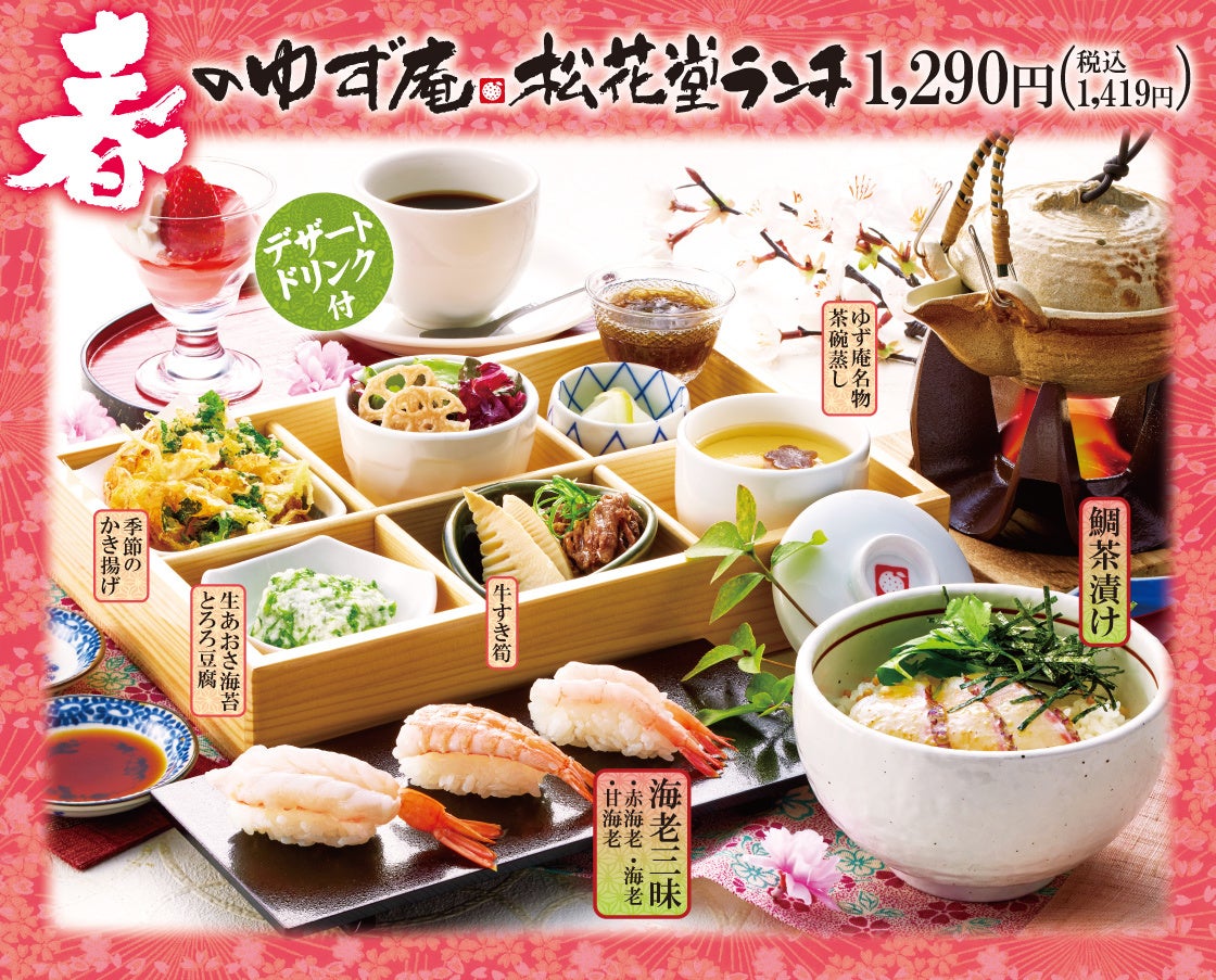 季節ごとに献⽴が変わるゆず庵⼈気のランチメニューです。春は、真鯛を使った「鯛茶漬け」をはじめ、旬な海老を贅沢に使ったお寿司「海老三昧(甘海老・赤海老・海老)」「牛すき筍」や愛知県産 あおさ海苔を使った「生あおさ海苔とろろ豆腐」が入った 松花堂ランチが新登場いたします。 デザート・ドリンク付きのセットは大人気な「いちご大福」 「いちごプリン」 「いちごのショートケーキ」などの春期間限定デザートも選べるお得なメニューです。