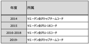 ツエーゲン金沢トップチームコーチ - ツエーゲン金沢U-18コーチ - ツエーゲン金沢U-15コーチ - ツエーゲン金沢トップチームコーチ