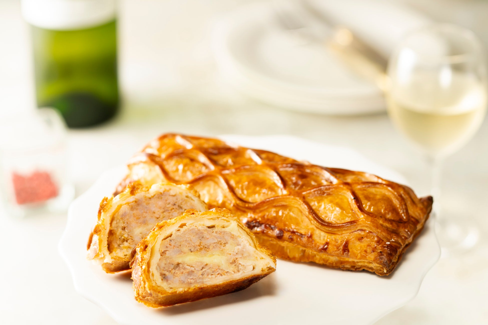 京都産豚肉と仔牛肉がベースのこだわりの具材とフランス産コンテチーズを外はサクッ、中はしっとりなパイ生地で包んだ逸品。