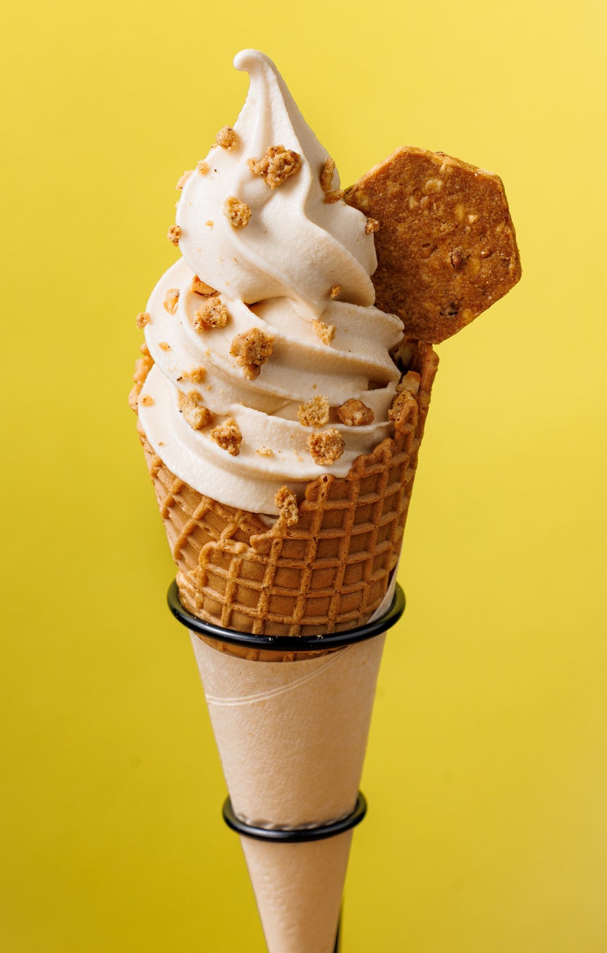 パリ発のビスケット専門店。香ばしいバター風味のビスケット「ピュール・ブール」を砕いて混ぜ込み、クランブルと六角形のビスケットをトッピングしたソフトクリーム。