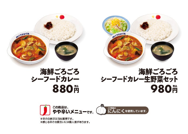 | 商品名 海鮮ごろごろシーフードカレー 880円 海鮮ごろごろシーフードカレー生野菜セット 980円 海鮮ごろごろシーフードカレー単品 760円 ※お持ち帰りいただけます。お持ち帰りにみそ汁は付きません。 お持ち帰りの場合、みそ汁は別途60円でお求めいただけます。 ※全て税込み価格です。また、店内・お持ち帰りの税込価格は同一です。 発売日 2022年6月28日(火)午前10時 ~ ※発売を記念して「海鮮ごろごろシーフードカレー」をご注文のお客様を対象に、 2022年7月12日(火)10時まで、ライス大盛を無料サービスします。 対象店舗 一部店舗を除く全国の松屋 |