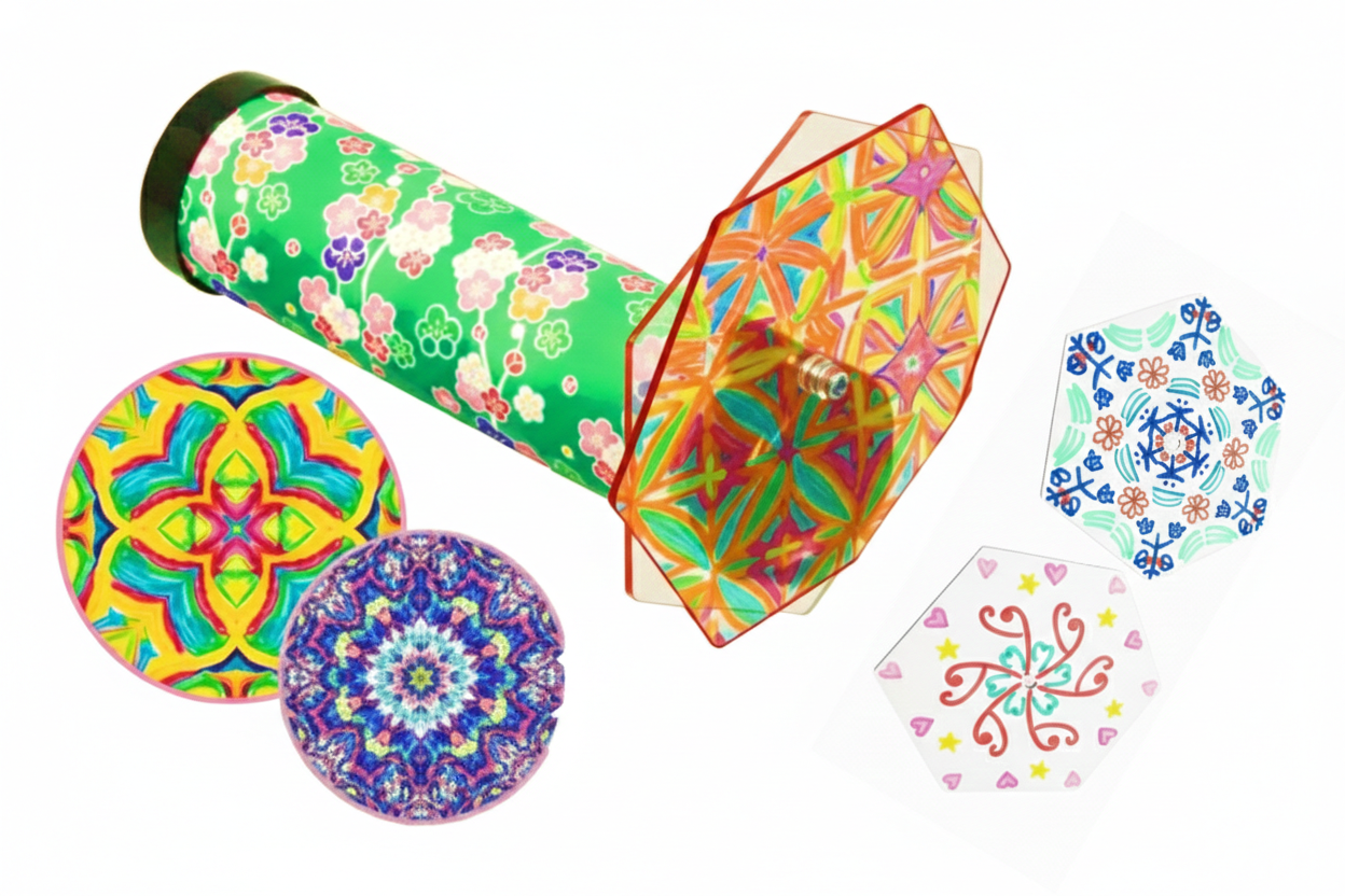色や形を自由に組み合わせて、世界にひとつだけの万華鏡をつくろう!2枚のプレートを入れ替えるだけで、くるくる変わる不思議な模様。のぞいた先にあなただけの模様が生まれます。