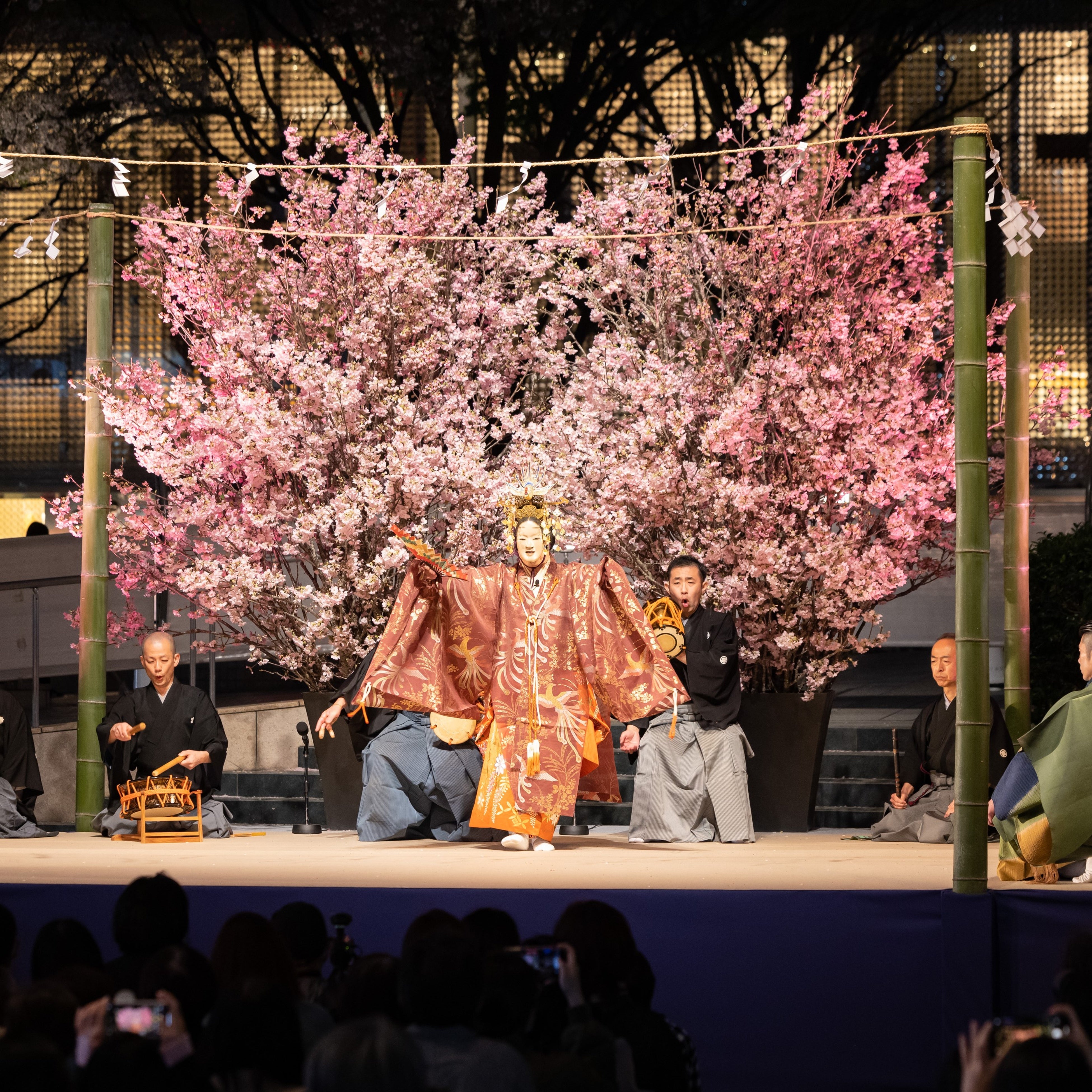六本木ヒルズアリーナのステージでは、初日となる3日に京都の初夏の風物詩「京都薪能」のスペシャルプレ公演を、4日には「社会問題に挑むかぶき者」による創作歌舞伎、5日には日本遺産にも登録された島根県の伝統芸能「石見神楽」をお届けします。京都薪能では、春の清水寺を舞台にした能《花月》を上演。桜咲き誇る春の宵、皆様を幽玄の世界へといざないます。