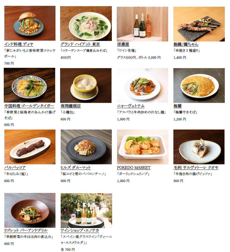 参加店舗:インド料理 ディヤ|グランド ハイアット 東京|信濃屋|鮨鐡/鐵ちゃん|中国料理 ゴールデンタイガー|南翔饅頭店|ニャーヴェトナム|梅蘭|バルバッコア|ヒルズ ダル・マット|POKEDO MARKET|毛利 サルヴァトーレ クオモ|リゴレットバーアンドグリル|ワインショップ・エノテカ