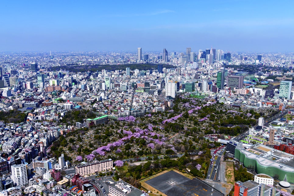 六本木ヒルズ展望台 東京シティビューでは、都内のお花見スポットを“天空”からご覧いただけます。特に、眼下に広がる青山霊園の桜の十字路は圧巻です。東京タワーや東京スカイツリーなど、東京ならではの風景とともにお楽しみください。