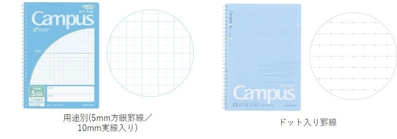 リングノートなので、折り返しても平坦で書きやすく、特長である「やわらかリング」は、手が当たっても痛くなりにくく端まで書きやすいノートです。『用途別(方眼罫線)』『ドット入り罫線』の2種類の罫内容をラインアップ。 『用途別』は消しあとが残りにくく、なめらかな書き心地のオリジナルペーパーを採用。 『ドット入り罫線』は、ドットが入っていることで、文字列を揃えたり、グラフや図形の線などが書きやすい罫線です。
