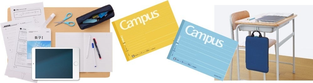 そこでコクヨでは、自宅学習や充電のためにICTツールを持ち帰ることで負荷が増した『学習ツールの持ち運び』や、タブレットやPCを使いながらも、教科書や参考書の広がる机の上で、プリントに書き込むなど『机上面のスペース不足』、に関する学生の困りごとに注目。現代のまなびシーンをより快適にサポートする学習アイテムを提案します。