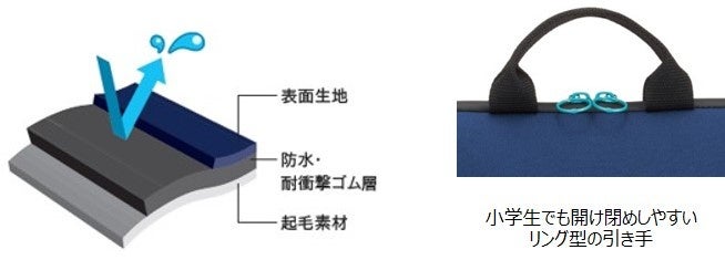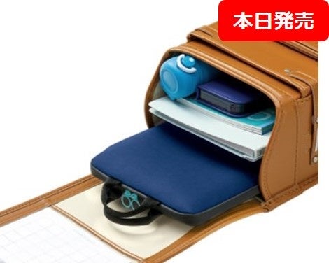 外側にポケットがないフラットな形状でランドセルに出し入れしやすく、衝撃・浸水からPC・タブレットを守る。