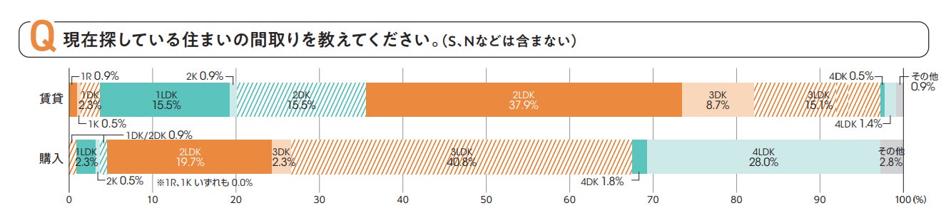 賃貸は「2LDK」37.9%、購入は「3LDK」40.8%で最多