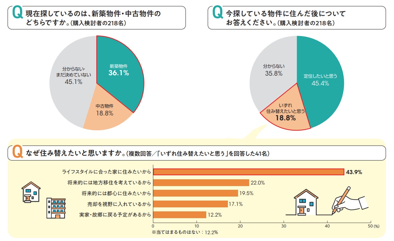 購入を検討する共働き夫婦のうち、新築物件を探している人は約4割、中古物件は約2割でした。また探している物件に住んだ後について聞くと「定住したいと思う」は半数で、「いずれ住み替えたいと思う」を選択した人は約2割でした。また「いずれ住み替えたいと思う」を選択した人に理由と聞くと、「ライフスタイルに合った家に住みたいから」が最多で43.9%でした。