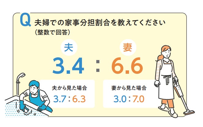 夫婦の家事分担割合を聞くと、夫が3.4割、妻が6.6割という平均結果がでました。夫から見た場合と妻から見た場合を比較すると、0.7ポイントの差が生じました。