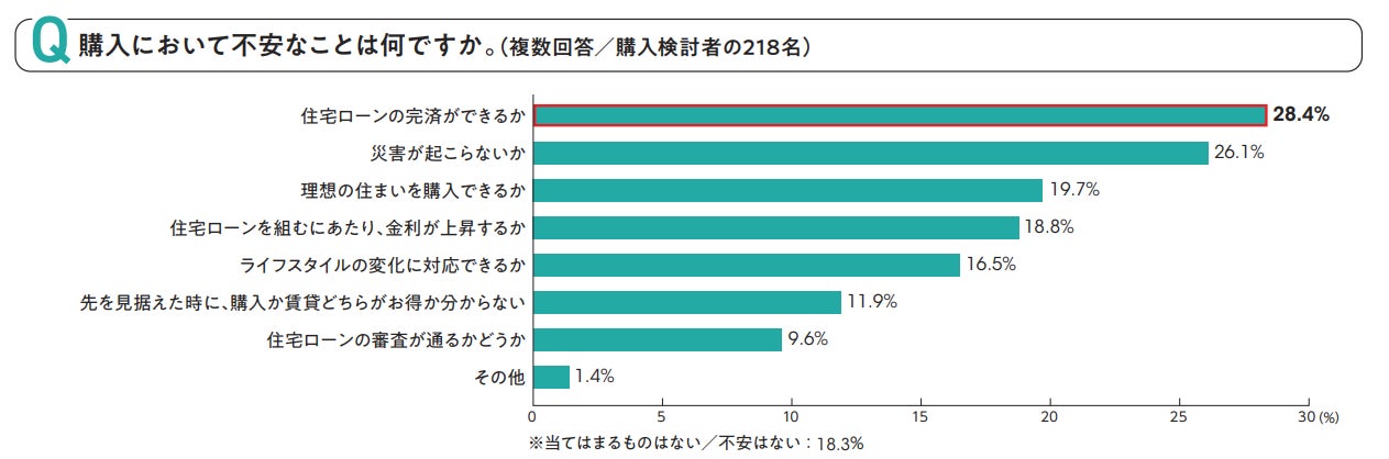 物件購入において不安なことは、「住宅ローンの完済ができるか」が28.4%で最多でした。次いで、「災害が起こらないか」「理想の住まいを購入できるか」が続きました。人生の一大イベントである物件購入においては、高額のローンを借り入れる人が多いですが、毎月支払えるか・完済できるかなどの不安が大きいようです。