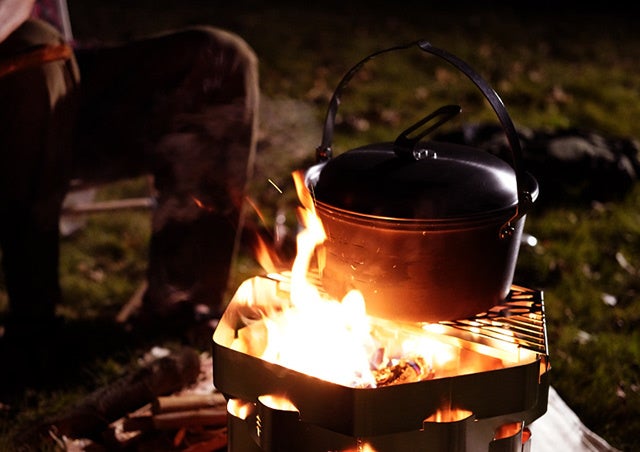 薪を燃やして焚き火を楽しんだり、付属の焼き網でアウトドア料理を作ることも。