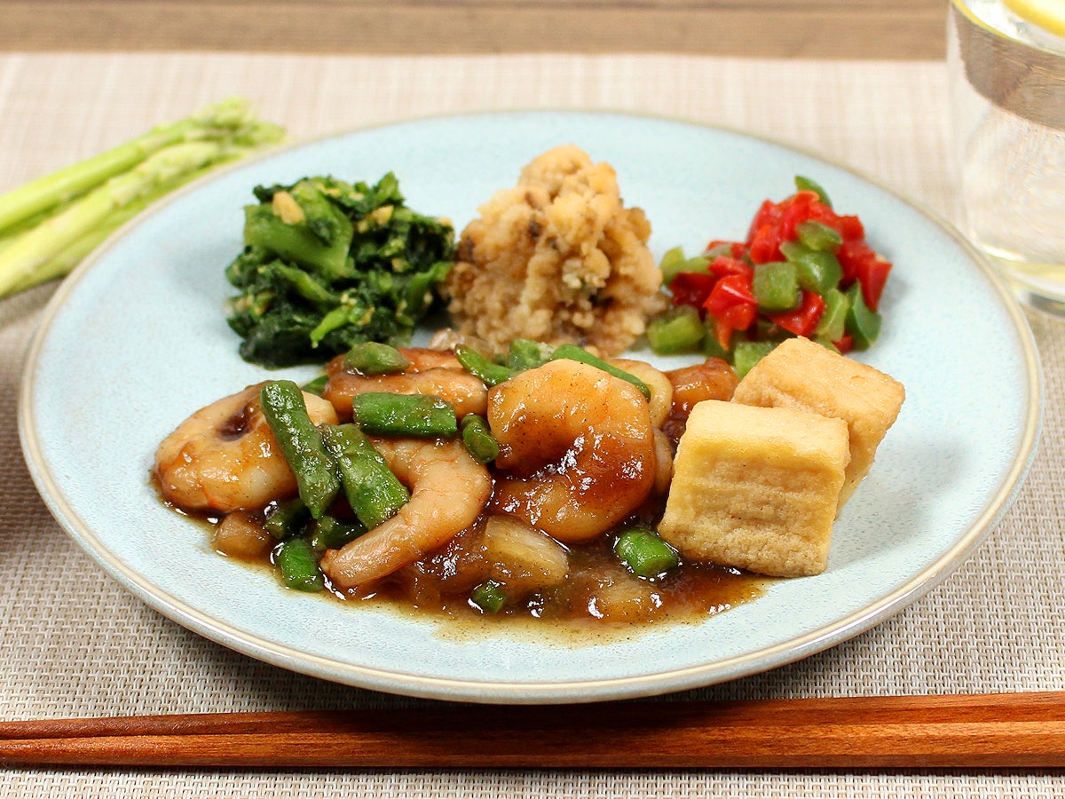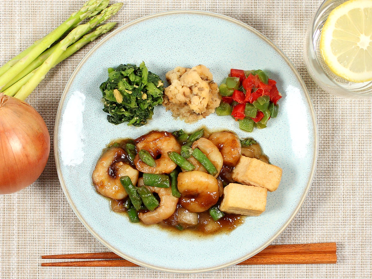 山椒香る醤油ベースのたれを、プリプリの海老と絹揚げ豆腐にかけました。添え野菜にはアスパラと玉ねぎを使用しています。