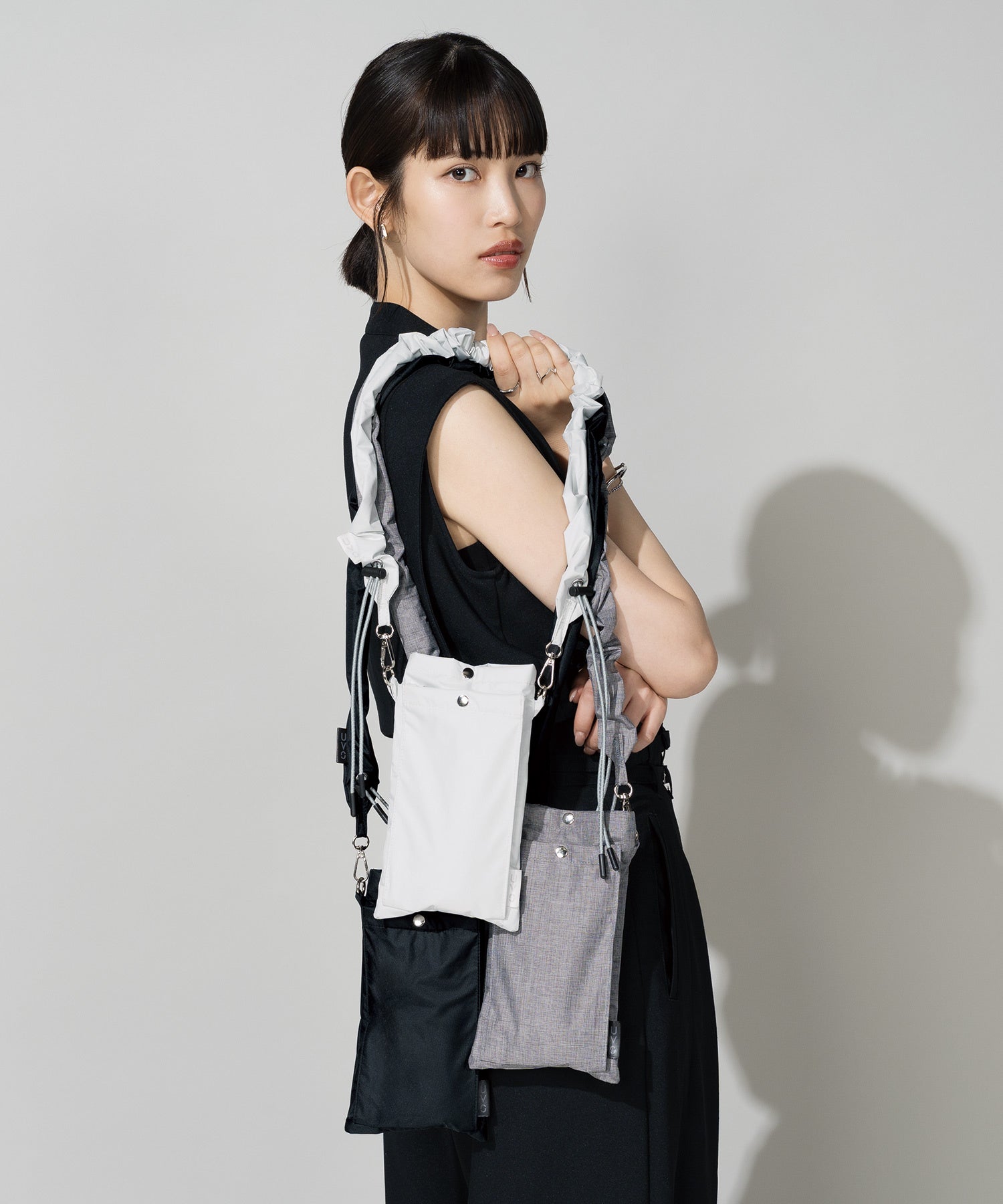 オフ/グレー/ブラックのクールな3色展開で、くしゅっとしたシャーリングタイプのポシェットにはスマホなどが入るポケットも付いています。傘の直径は96cmと大きめサイズなのが嬉しいポイント。