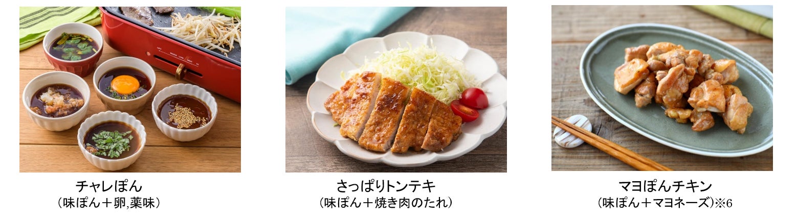 “味ぽん“は、かんきつ果汁・醸造酢・しょうゆが絶妙なバランスでひとつになっているからこそ、様々なものとの相性が良い調味料になっています。今回の焼肉においても、アレンジとして「大根おろし」や「わさび」も挙げさせていただきましたが、そのほかにも様々なつけだれで楽しんでいただける「チャレぽん®」というレシピもご紹介しています。※4