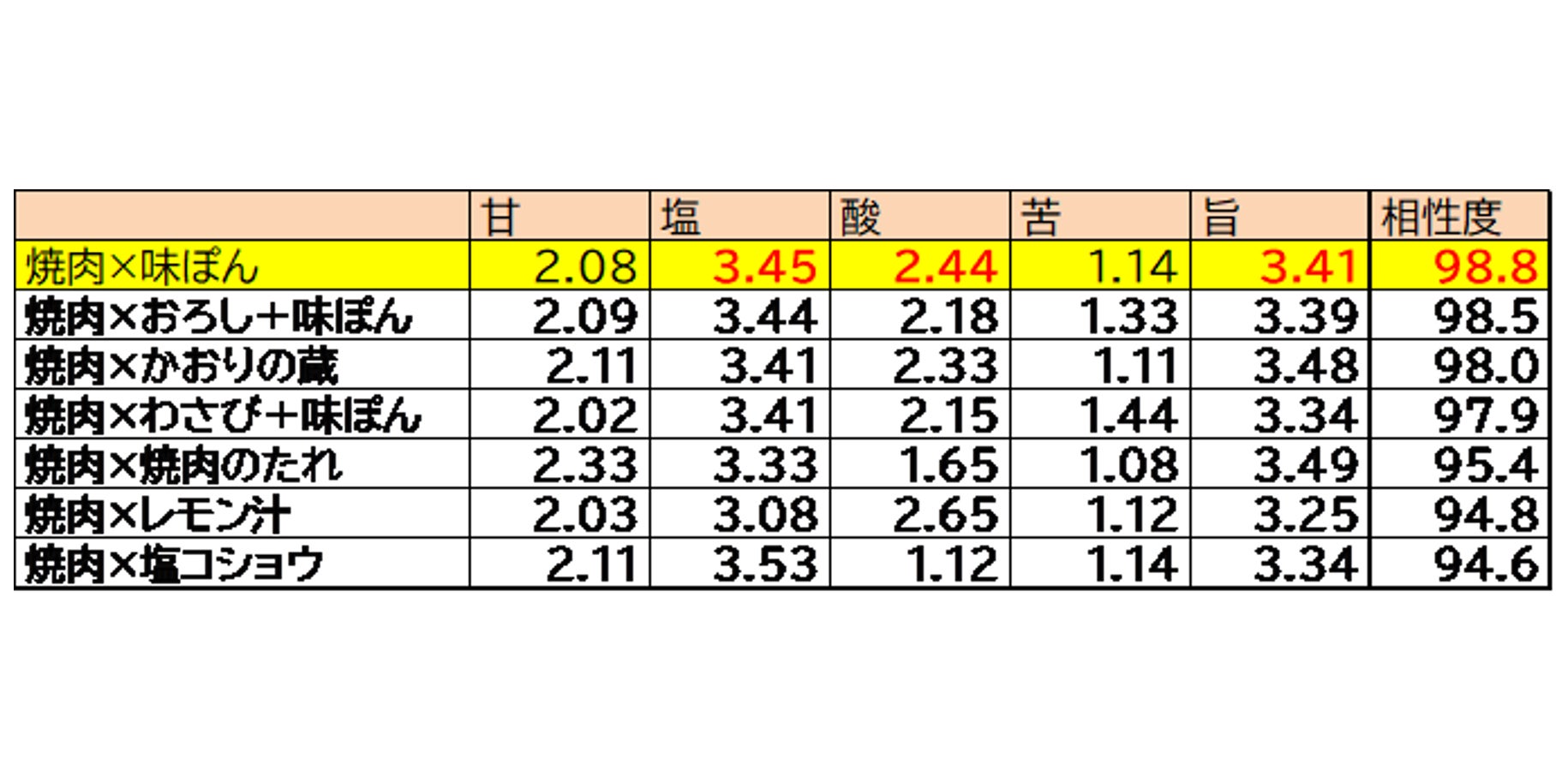 今回の”焼肉×味ぽん”の結果は、塩味、旨味の強さが3~3.5の間をキープしており、それを酸味が引き立てる、まさしく「絶品の味」と言えるのではないでしょうか。