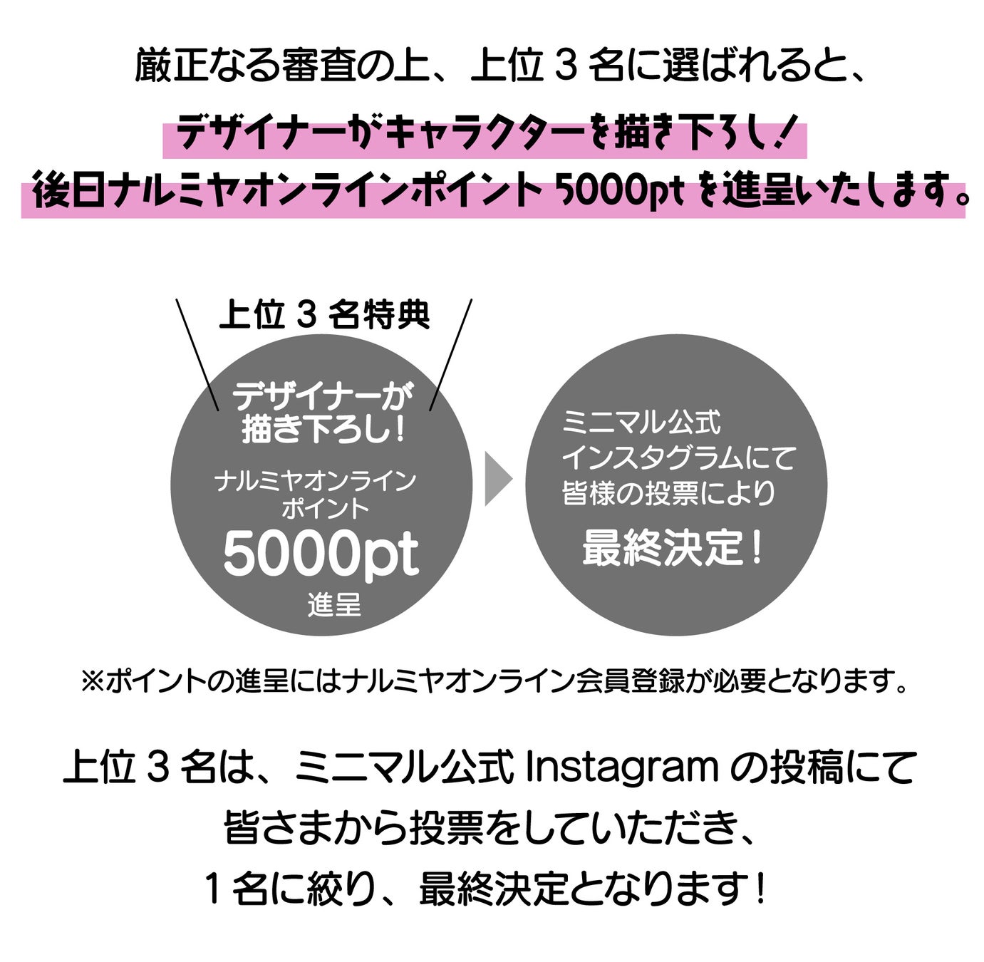ミニマル公式Instagramの投稿で皆さまからの投票によって最終採用1名のキャラクターに絞り、決定いたします。
