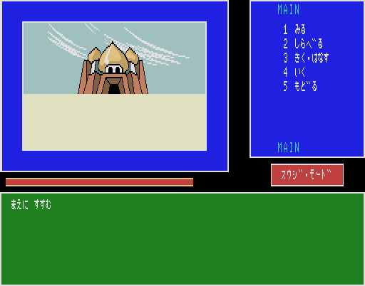 ゲームはコマンド選択方式+入力方式のアドベンチャーゲームとなっており、シーンに応じて「数字モード(選択)」、「会話モード(入力)」を駆使して攻略することになります。当時、本作は“スチャラカアドベンチャー”と称していたことからもわかるように、軽快でユーモラスな展開も見どころのひとつです。