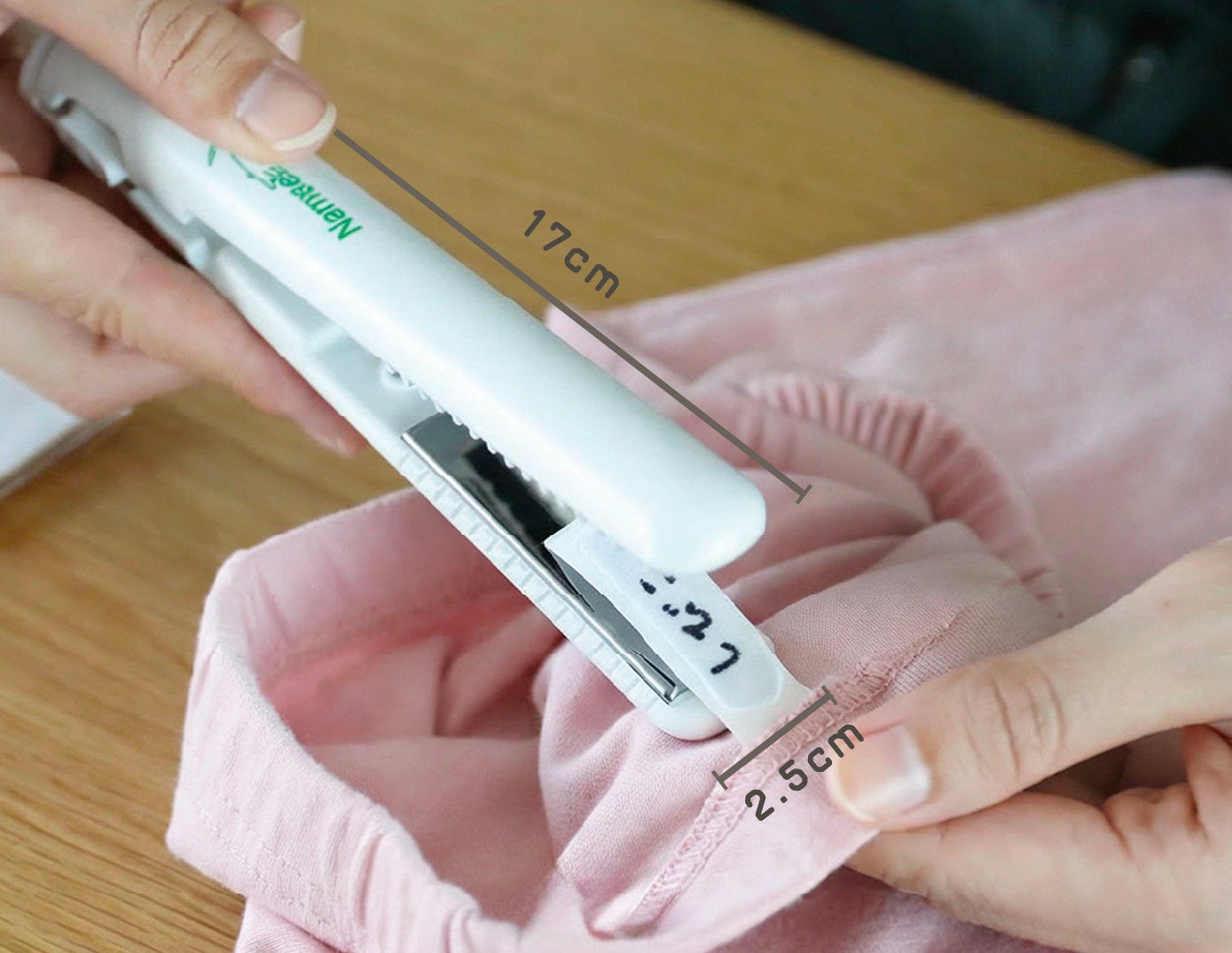 服のタグにアイロンネームを置いたら、あとはギュッと挟むだけ。