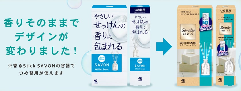 「Sawaday 香るStick SAVONホワイティッシュサボン」も同時にパッケージデザインの見直しを行いました。やさしいせっけんの香りのイメージにぴったりなナチュラルなデザインにアップデートします。(自然切替にて順次発売予定)