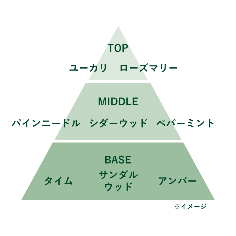 シダーウッド、パインニードルなどの豊かな木々の香りをベースに、ユーカリやミントのすっきりとしたハーブの要素を加えた親しみやすいアロマティックウッディ調の香りです。お部屋を優しくナチュラルに演出できるような、穏やかな香りを目指しました。