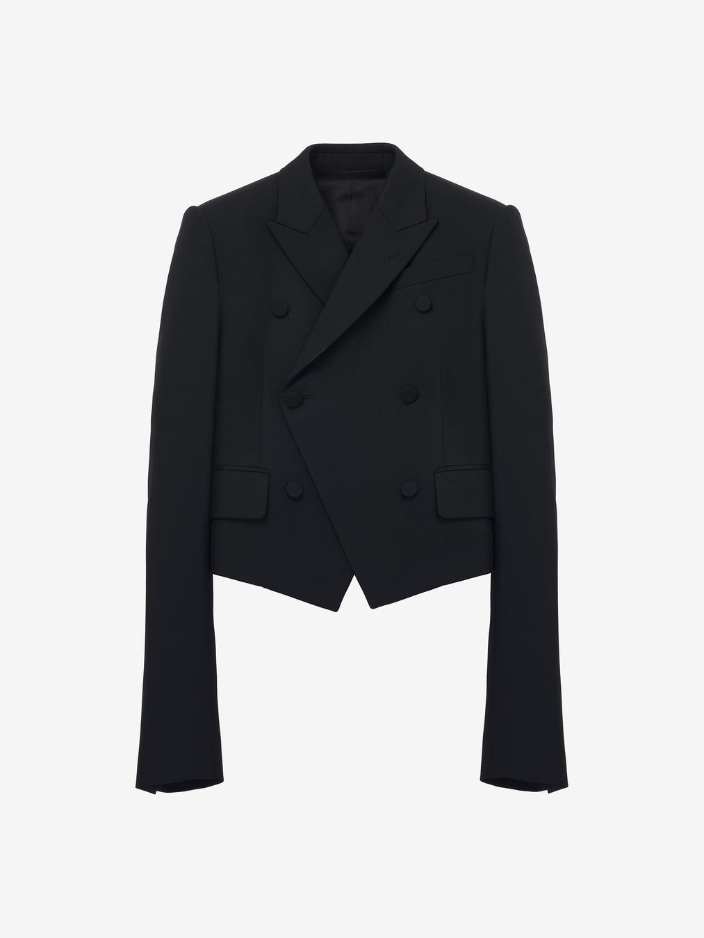 2025年春夏コレクションより、ダブルブレスト シュランク ブレザーにローウエスト シガレットパンツを合わせています。