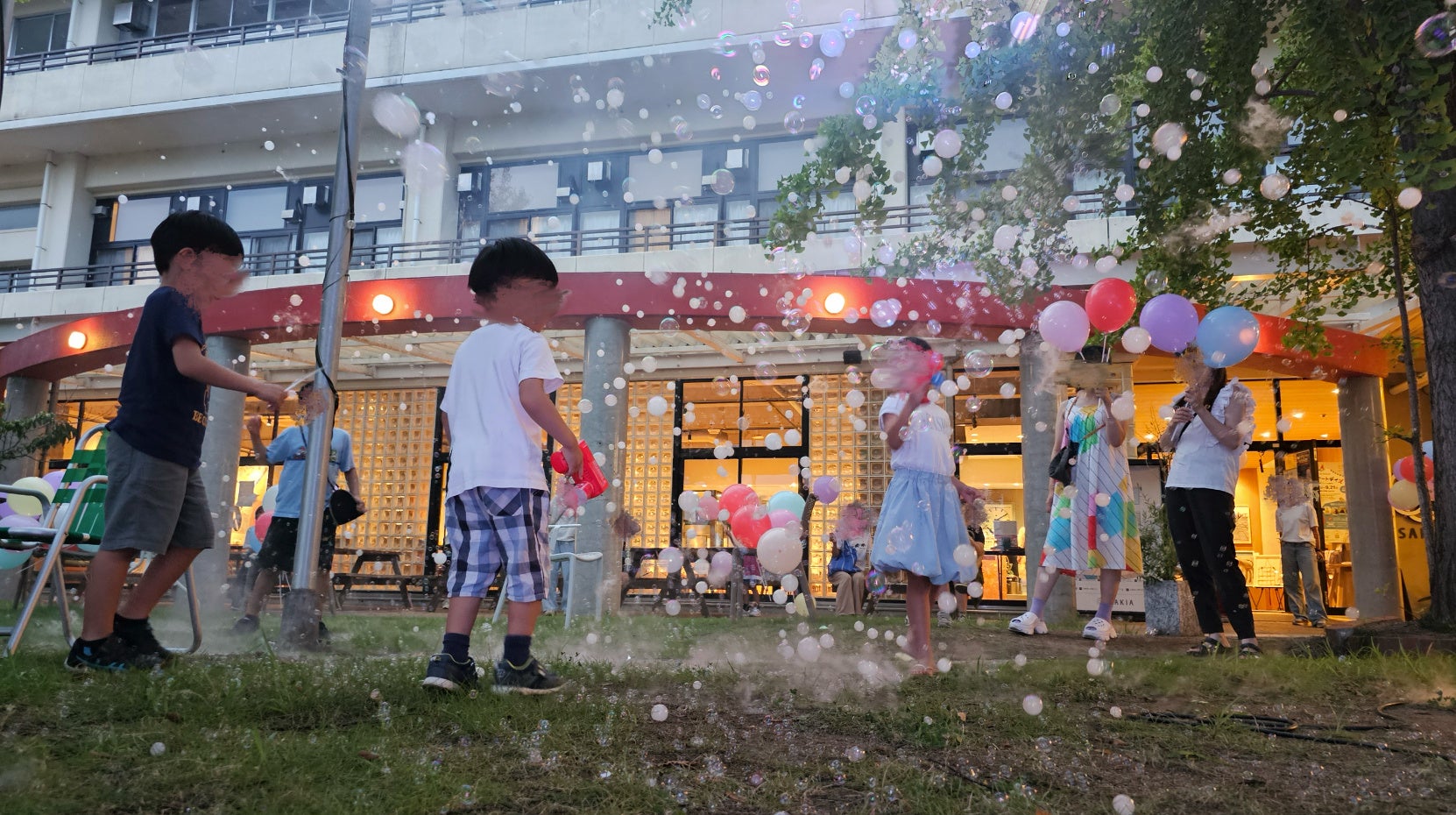 当日は、手にした瞬間から心が躍る光るバルーンと、夜空を漂う無数のシャボン玉が、旧校舎と校庭を幻想的に彩りました。