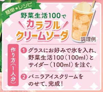「野菜生活100 まろやか3種のももミックス」は、白桃と黄桃とネクタリンのまろやかな甘さで、季節のおいしさをお届けする野菜・果実ミックスジュースです。砂糖不使用で、たっぷりビタミンCを摂ることができ、家族みんなでおいしくお飲みいただけます。パッケージは、3種の桃の贅沢感を表現しながら、桃色を広く使い、春の訪れや新生活の始まりをイメージしました。本品を使用した簡単アレンジとして、サイダーを入れて、バニラアイスクリームをのせる「カラフルクリームソーダ」をおすすめしています。