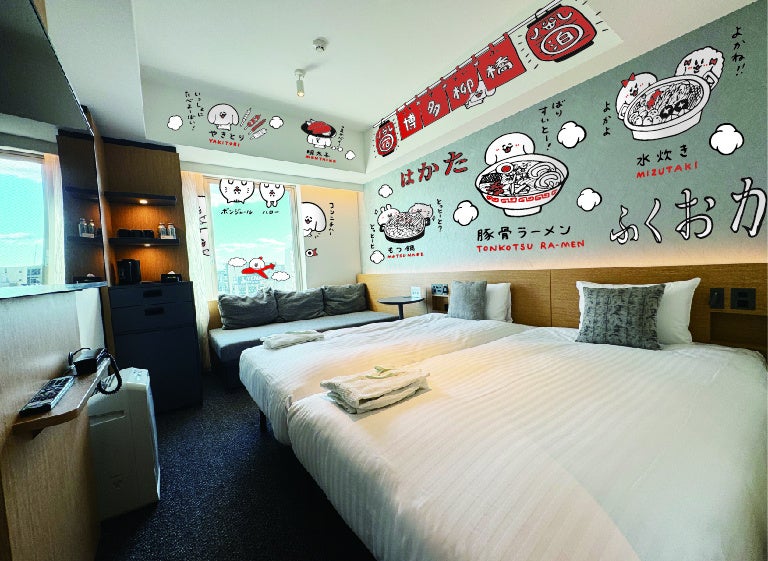 今回のコラボレーションプランは、 ぺろちらしいゆるい励ましの言葉で疲れた心を癒してくれる『ゆるセリフルーム』とぺろちと仲間たちが福岡を代表する美味しいグルメを紹介してくれる『博多づくしルーム』の2部屋限定です。ぺろちファンだけでなく、福岡に訪れるかわいいもの好きのお客さまが自然と笑顔になれるお部屋をご用意しました。