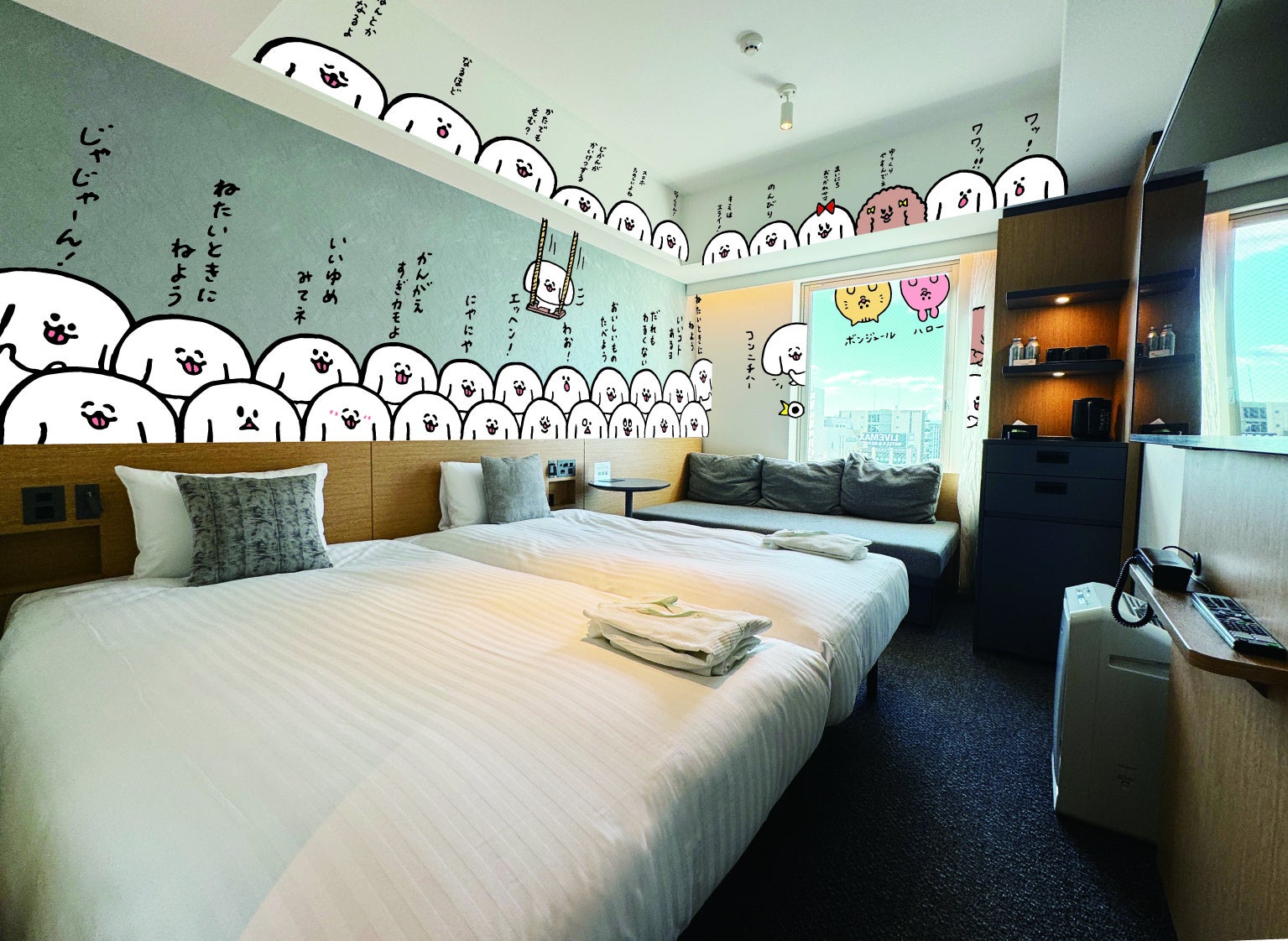 客室全体に広がるぺろちの愛らしい姿と、心をくすぐる“ゆるセリフ”が、癒しと楽しさをお届けする『ゆるセリフルーム』は、壁や扉、窓まで、どこを見ても『ぺろちワールド』全開!お部屋にいるだけで、笑顔があふれる体験をお楽しみください。