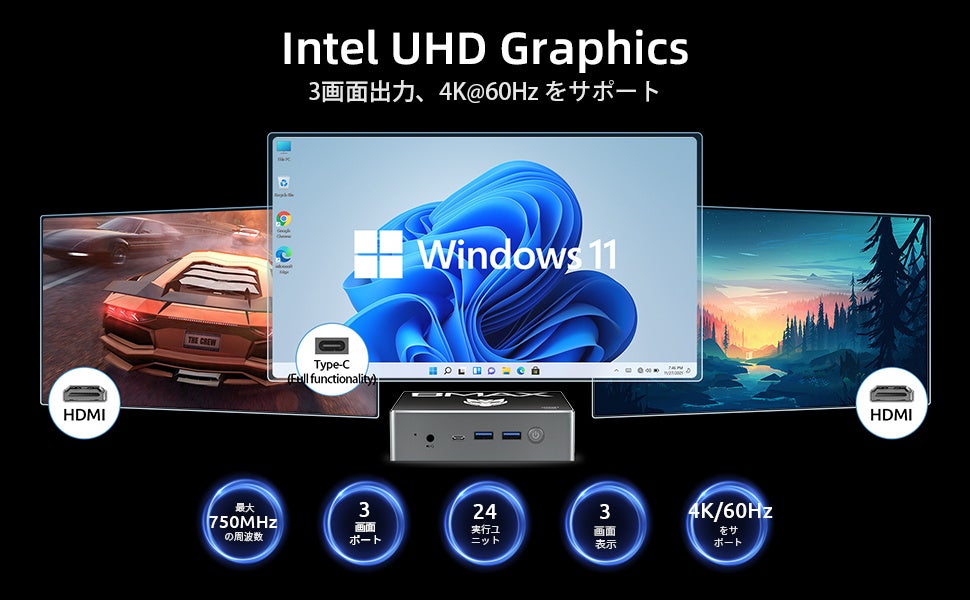 高解像度4K UHDディスプレイや3画面出力に対応しています。HDMI 2.0b×2、Type-Cポートを介して、テレビ、モニター、プロジェクター、プリンターなどに接続できます。3画面同時出力で生産性を高め、マルチタスク機能を強化します。コストや管理の負担を軽減しました。第12世代インテルAlder Lake N100は、より安定した画質が得られます。4K再生も問題なし。PS、ビデオクリップ、YouTubeなどをスムーズに実行できます。
