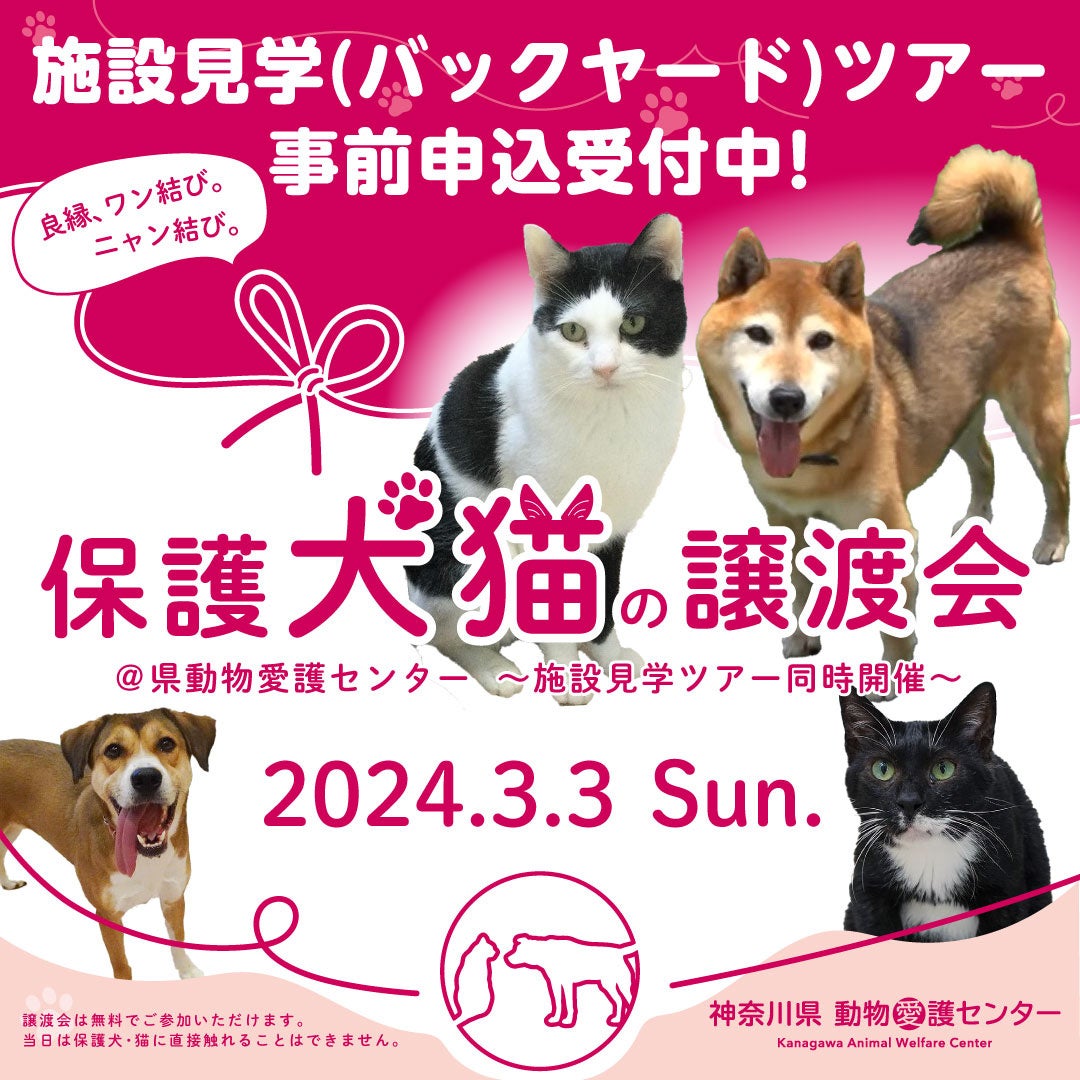 ・当日は動物の譲渡はありません。実際に保護犬猫を譲り受ける際には、神奈川県又はその隣接都県(東京都、山梨県及び静岡県)に在住であること、譲渡前講習会を受講していること等の条件があります。詳細は、県動物愛護センターのホームページをご覧ください。