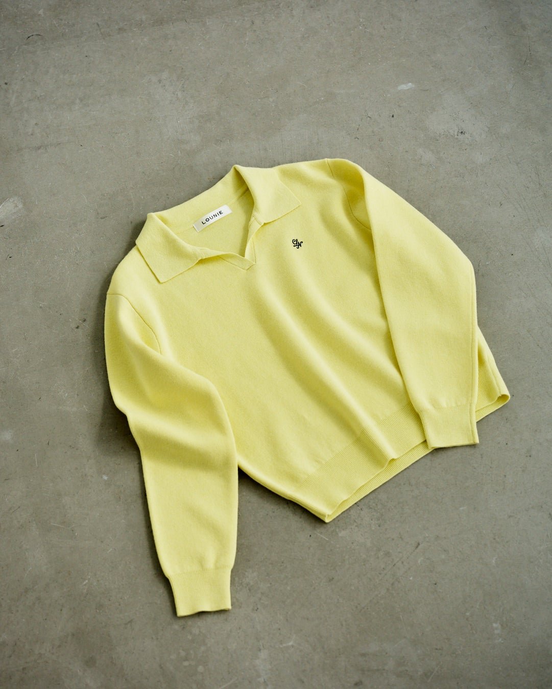 春らしいイエローカラーのニットの胸元にはさりげなく「LN」の刺繍を施しました