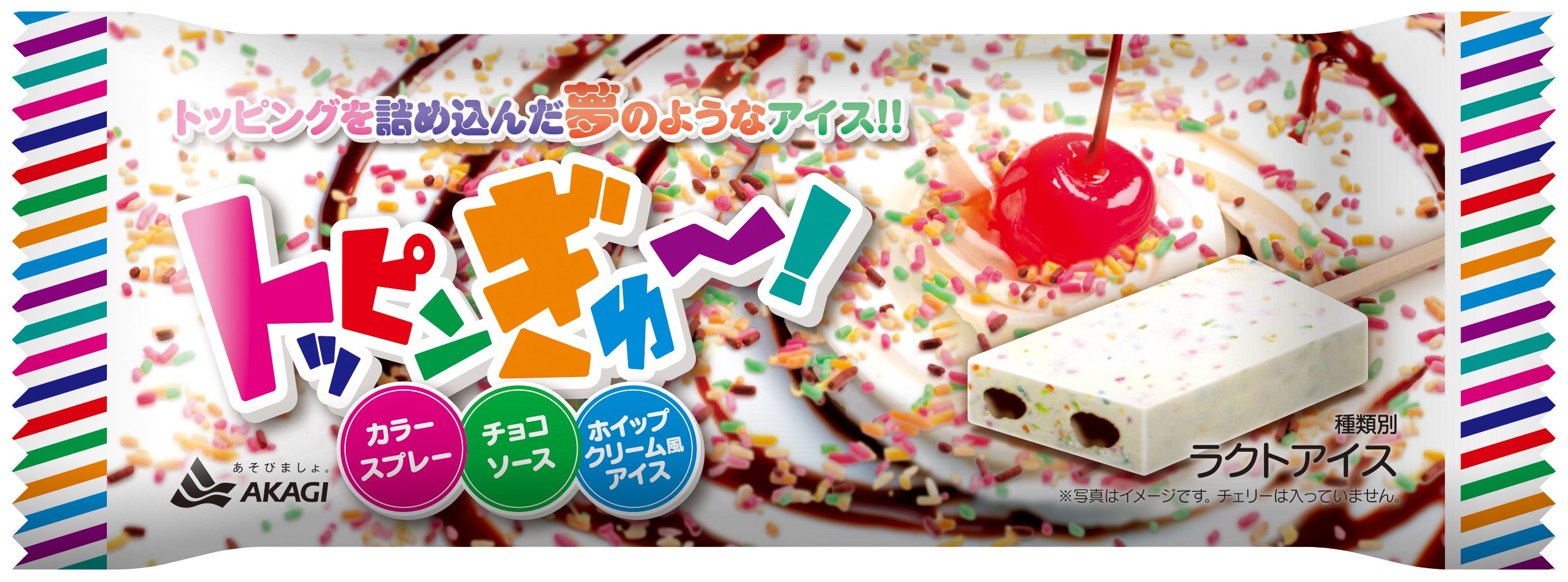 子どもの頃の夢を、大人になったあなたへ!「カラースプレー」「チョコソース」「ホイップクリーム風アイス」の3種をぎゅ~っと1本に詰め込みました!「トッピンぎゅ~!」