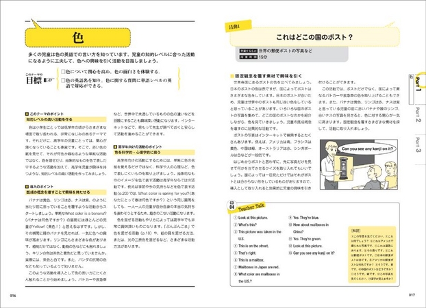 単に英語の表現を紹介するところから始めるのではなく、どこに着眼して導入すればいいかを、テーマごとにまとめています。高学年の学習レベルに合わせた発展のさせ方がよく分かります。